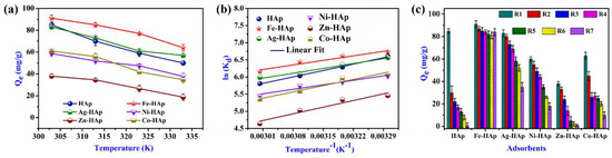 (a) Temperature (time = 1 min, Co = 200 mg/L, pH= 7, dosage = 40 mg, volume = 40 mL, and rpm = 200); (b) van’t Hoff linear plot; (c) regeneration (time = 1 min, Co = 200 mg/L, pH = 7, dosage = 40 mg, volume = 40 mL, rpm = 200, and temperature = 303 K).