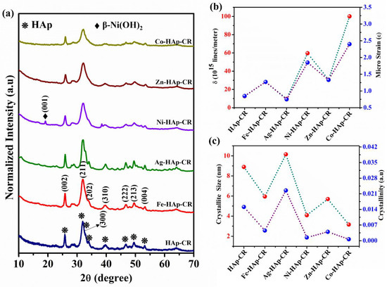(a) X-ray diffraction spectrum of pristine HAp and different cation-incorporated HAp nanoparticles. The cation’s influence on the crystalline parameter: (b) dislocation density (red) and microstrain (blue); (c) crystallite size (red) and crystallinity (blue).