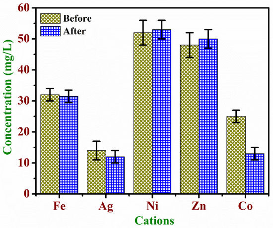 The leaching of cations before and after the adsorption of CR is shown in Figure 10. The estimated incorporation of metallic ions before adsorption in the Fe-HAp, Ag-HAp, Ni-HAp, Zn-HAp, and Co-HAp was 32, 14, 52, 48, and 25 mg/L, respectively. Accordingly, the amount of ion incorporated, in ascending order, is Ni-HAp > Zn-HAp > Fe-HAp > Co-HAp > Ag-HAp. Moreover, after the CR adsorption, apart from Ag-HAp and Co-HAp, all of the adsorbents exhibited insignificant leaching (<2%). The Ag-HAp and Co-HAp had low colloidal stability, which increased the ion exchange process during the CR adsorption process. Hence, 14% of Ag+ (2 mg/L) and 52% of Co2+ (12 mg/L) ions were leached out from the Ag-HAp and Co-HAp particles, respectively.