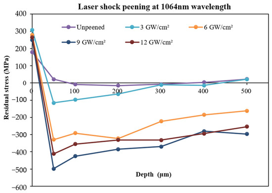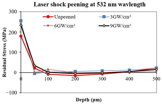 - The residual stress depth profile shows that there is a substantial induction of compressive residual stress in the laser-processed samples at the 1064 nm wavelength and pulse densities of 3, 6, 9, and 12 GW/cm2. The maximum compressive residual stress of −498 MPa was attained at a laser pulse density of 9 GW/cm2 and the fundamental wavelength (1064 nm).