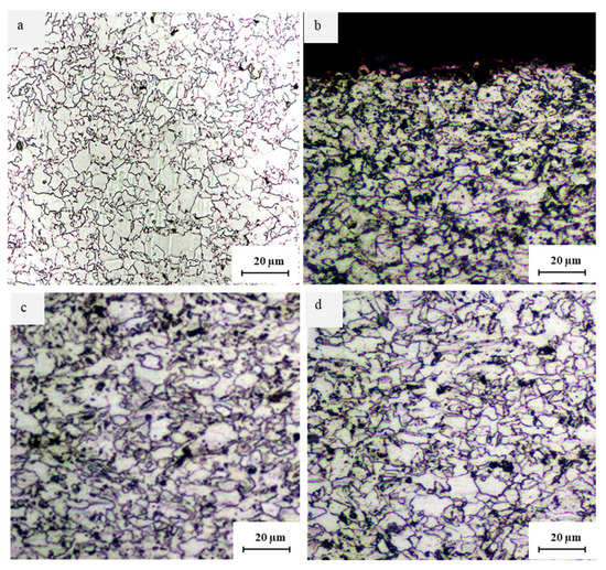 Cross-sectional micrographs of microalloyed steel sample (a) in unpeened condition and after laser shock peening at 1064 nm and 9 GW/cm2 (b) in subsurface region, (c) below subsurface, region, and (d) in midsection region.