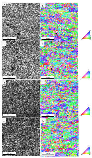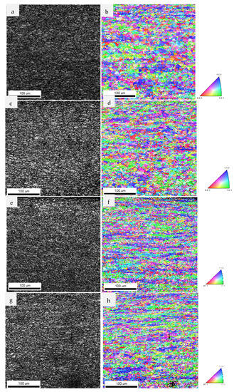 IQ and IPF mapping of LSPwC microalloyed steel at 1064 nm with (a,b) 3 GW/cm2, (c,d) 6 GW/cm2, (e,f) 9 GW/cm2, and (g,h) 12 GW/cm.