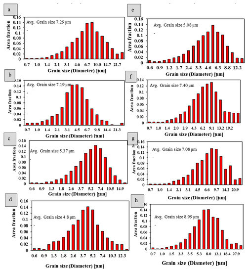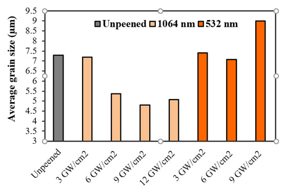 The grain size distribution analysis (Figure 7a–e) in the subsurface region of the LSP specimen in the 1064 nm condition shows that there is considerable grain refinement, and it increases progressively with the energy density. This indicates that the proportion of smaller grains (size 1.38–6.3 µm) increases with the increasing energy density of the laser (3, 6, 9, and 12 GW/cm2). The grain size distribution analysis of the specimen peened with the second harmonic wavelength (532 nm), in contrast, indicates that there is no grain refinement; in fact, there is some degree of grain coarsening. This may be attributed to recrystallization due to the involvement of high temperatures. The average grain size plot is shown in Figure 8. The absence of grain refinement with 532 nm peening is in line with an insignificant level of compressive residual stresses imparted when peened at this wavelength.
