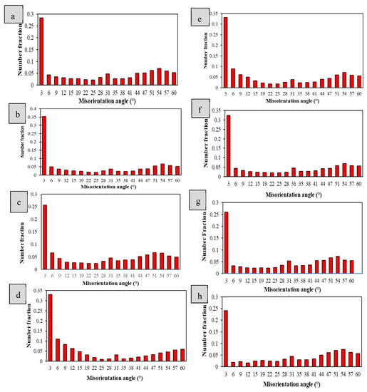 Grain boundary misorientation distribution in the subsurface region of microalloyed steel specimen (a) in unpeened condition; after LSP at 1064 nm with (b) 3 GW/cm2, (c) 6 GW/cm2, (d) 9 GW/cm2, and (e) 12 GW/cm2; and after LSP at 532 nm with (f) 3 GW/cm2, (g) 6 GW/cm2, and (h) 9 GW/cm2.
