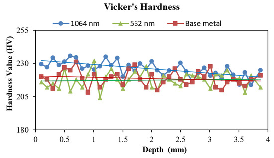 The microhardness distribution as a function of depth is shown in Figure 10. The microhardness measurements were carried out on the LSPwC specimens exposed to the fundamental wavelength (1064 nm) and the second harmonic wavelength (532 nm) at a pulse density of 9 GW/cm2. The microhardness values of the peened specimens were compared with that of the baseline specimen (unpeened specimen). The average hardness magnitudes across the subsurface regions of the unpeened specimens and specimens after LSP at 1064 nm and 532 nm with 9 GW/cm2 are 223.2 HV, 218.7 HV, and 217.6 HV, respectively. From the microhardness results, it is apparent that the LSP specimen at 1064 nm shows a higher trendline value than the baseline specimen and the LSP specimen in the 532 nm condition. The microhardness distribution studies also support the beneficial effect of the compressive residual stress imparted by the 1064 nm wavelength condition.