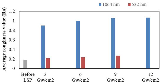 A surface roughness study was conducted on the laser-shock-peened surface in the fundamental wavelength (1064 nm) and second harmonic wavelength (532 nm) conditions, and the results are given in Figure 11. The average surface roughness values of specimens irradiated with the 1064 nm wavelength at laser pulse densities of 3, 6, 9, and 12 GW/cm2 are 0.899, 0.994, 1.061, and 1.066 μm, respectively. The average surface roughness values of specimens irradiated with the 532 nm wavelength at laser pulse densities of 3, 6, and 9 GW/cm2 are 0.202, 0.228, and 0.264 μm, respectively. In the 532 nm condition, the specimen shows an insignificant increase in the surface roughness value. It is evident from the results that the LSPwC specimen at the fundamental wavelength (1064 nm) shows a higher surface roughness value than the specimen treated with the harmonic wavelength (532 nm).