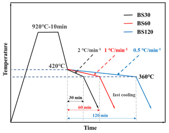 The chemical composition of the steel in this study is presented in Table 1. It was prepared by vacuum induction melting and then reheated to 1200 °C for forging. The billet was homogenized at 1200 °C, followed by hot rolling to a 5 mm thickness. The hot-rolled sheet was then cold rolled down to a 1.6 mm thickness after the acid-pickling process. Cuboid samples 10 × 1.5 × 1 mm3 in size were cut from the cool-rolled sheets by wire cutting, and they were adopted for the measurement of the martensite transformation starting (Ms) temperature after full austenitization using a high-resolution DIL 805A/D dilatometer (Bärh, Hüllhorst, Germany). The continuous cooling process for bainitic transformation was designed according to the measured Ms temperature, which allows the transformation to proceed gradually. The heat treatment process, revealed in Figure 1, was performed on both cuboid samples using a dilatometer and cool-rolled sheets using furnaces. The heat treatment processes include fast cooling to 420 °C after austenitization at 920°C for 10 min, and then slowly cooling down to 360 °C at three cooling rates of 2 °C·min−1 (bainitic transformation for 30 min), 1 °C·min−1 (bainitic transformation for 60 min) and 0.5 °C·min−1 (bainitic transformation for 120 min), followed by water quenching (fast cooling) to ambient temperature. Three samples treated by the processes described above are labeled as BS30, BS60, and BS120, respectively.