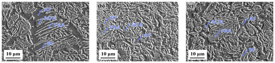 SEM micrographs of the three samples with different cooling rates. (a) BS30; (b) BS60; (c) BS120. Note that AF, M/A, BF, and FRA are allotriomorphic ferrite, blocky retained austenite, bainitic ferrite, and film-like retained austenite, respectively.