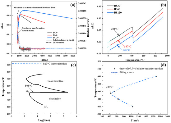 (a) The curves of the relative change of length and the dilation rate as a function of time during the slow cooling process; (b) the relative change of length as a function of temperature during the process of cooling to ambient temperature; (c) TTT diagrams calculated by the MUCG83 thermodynamic model; (d) the time and temperature curve for 99.9% of the bainite transformation measured with a dilatometer.