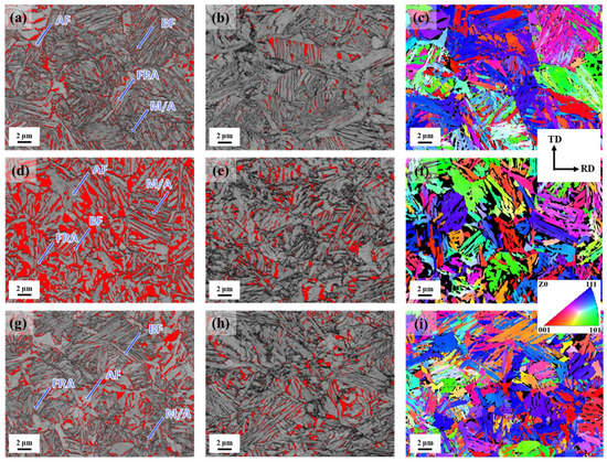 The EBSD micrographs present two morphologies of retained austenite, blocky retained austenite partially transformed into martensite and film-like retained austenite between the bainitic ferrite plates (Figure 4a,d,g). The fractions of retained austenite were measured by EBSD to be 9.4 vol.%, 21.0 vol.%, and 10.5 vol.% for samples BS30, BS60, and BS120, respectively, which are lower than the XRD results of 11.5 ± 0.78 vol.%, 27.8 ± 0.36 vol.%, and 12.9 ± 1.31 vol.% for samples BS30, BS60, and BS120, respectively (Table 2). This is due to the limited resolution of the EBSD measurement, which may be explained by the possibly undetected film-like retained austenite on account of its smaller size. In addition, a smaller amount of austenite was retained in samples BS30 and BS120 than in sample BS60. The smallest amount of austenite was retained in BS120 after the slow cooling process, and more austenite was transformed into martensite in sample BS30 (Figure 5, Table 2). The martensite fraction was calculated to be 15.9 vol.%, 10.5 vol.%, and 12.1 vol.% according to the EBSD results (Table 2)