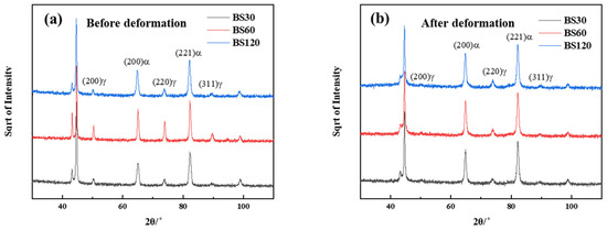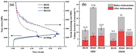 True stress–strain curves and work-hardening rate curves for samples BS30, BS60, and BS120 (a), the volume fraction of austenite before and after deformation, measured by XRD and EBSD (b).