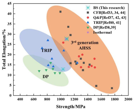 Additionally, samples BS60 and BS120 exhibited better tensile ductility (Table 3). The elongations of these two samples were 27.6 ± 0.3% and 27.8 ± 0.6%, respectively, which were greater than that of 12.9 ± 2.2% in sample BS30. The brittle fracture of hard martensite in the carbide-free bainitic steels generally provided nuclei for void growth [35]. Sample BS30 had the highest volume of martensite (Table 2). The larger amount of martensite in sample BS30 induced poor ductility, despite the contribution of the TRIP effect. Eventually, the product of strength and elongation (PSE) of samples BS60 and BS120 were comparable with the third-generation automotive steels (Figure 7) [33,34,36,37,38,39,40,41,42,43,44]. With regard to the considerations applicable to industrial production, the heat treatment of BS60 was optimal.