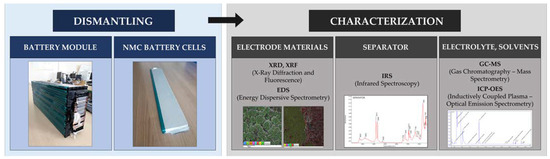 This work is based on our previous work [45]. Moreover, a detailed analysis of electrodes, separator, and electrolyte from the light and electron microscopy, infrared spectroscopy (IRS), and spectrometry field was added. The performed methods used for the individual battery cell components’ material characterizations are shown in the diagram according to Figure 2.