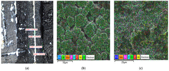 The cathode of the battery cell: (a) cross-section of a spinel double layer on Al foil with an illustration of materials layer thickness; (b) EDS element map of visually pure side of spinel layer; (c) EDS element map of spinel layer with separator residues.