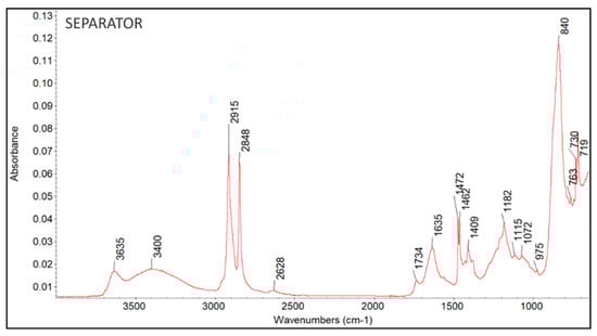 Due to the separator samples’ high fluorescence, it was impossible to use Raman spectroscopy to determine their composition. Therefore, the separator’s IR spectrum was measured, as shown in Figure 7.