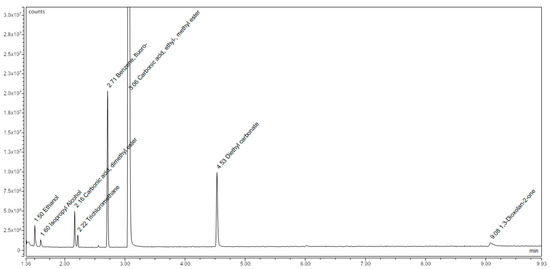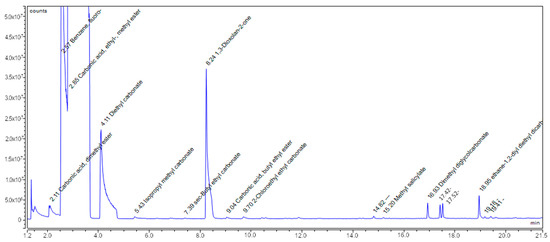 Solid-phase microextraction (SPME) revealed trace amounts of other carbonic acid esters with various carbon chain lengths, as visible in Figure 10. All these compounds have high vapor pressure and migrate into the air.