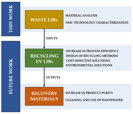 The results of this work create a basis for future work, as shown in Figure 11. Detailed material characterization of the NMC technology will be used to optimize the individual steps of currently used recycling techniques, focusing on achieving the highest possible process efficiency and purity of recovered materials whilst considering the investment and operating costs. Moreover, the environmental impact based on the performed analysis results will be described, including wastewater treatment (containing toxic electrolyte residues) or emissions generated during high-temperature processing. The work will also focus on recovery from secondary processes, e.g., wastewater, which would directly support the principle of lossless recycling.