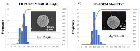 - Monodispersed spherical MoSiBTiC-La2O3 powders were successfully fabricated by a developed FD-POEM method. Raw Mo, MoB, Si, TiC, and La2O3 were uniformly dispersed within the FD-POEM powder. Moreover, the addition of nanoscale La2O3 powder has an insignificant effect on the particle sizes of fabricated FD-POEM powders.