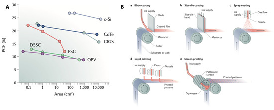 (A) Effect of active layer size on PV PCE for different technologies. (B) Roll-to-roll techniques for PSC development. (c-Si, crystalline silicon; CdTe, cadmium telluride; CIGS, copper indium gallium selenide; DSSC, dye-sensitized solar cell; OPV, organic PV). Adapted with permission from Springer Nature: Ref. [2], © 2023.