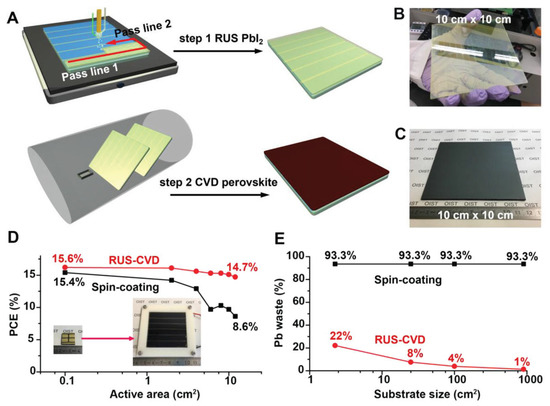 PCE and lead waste during perovskite deposition processes as a function of substrate size. (A) Schematic drawing of the RUS–CVD perovskite film deposition technology. PbI2films are RUS coated on the FTO/c-TiO2 substrates, and converted to FAPbIxBr3−x via a CVD process. Photographs of (B) a RUS-coated PbI2 film before annealing and (C) a CVD-converted FAPbIxBr3−x film deposited on a 10 cm × 10 cm patterned FTO substrate. (D) Solar cell and module performance as a function of active area. Spin-coating data are extracted from cited literature in ref. [12]. The RUS–CVD method shows much lower substrate size dependence than the spin-coating method. (E) Lead waste during the perovskite deposition process as a function of substrate size. Lead waste during the RUS–CVD process continuously decreases until it becomes negligible, much less than that generated during the spin-coating process. Reprinted from Ref. [12] with permission of Wiley-VCH.