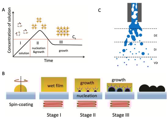(A) Lar Mer model for nucleation and growth of perovskite thin films. Cs is the supersaturation concentration of a precursor solution. (B) A schematic illustration of nucleation and growth of perovskite films at each stage. Reprinted from Ref. [22] with permission from Wiley-VCH. (C) Schematic representation of the three flow regimes, based on spraying for fuel combustion, during atomization: dense (DE), dilute (DI), and very dilute (VD) with respect to the concentration of the liquid in the spray cone. © IOP Publishing. Reproduced with permission [23]. All rights reserved.