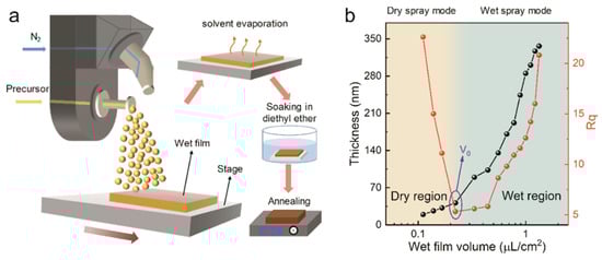 Sprayed film deposition mode. (a) Schematic illustration of a single-pass spray-coated perovskite film produced in wet spray mode. (b) Thickness and roughness of perovskite films as a function of the volume of the sprayed precursor on the substrate. V0 was the threshold of the dry region, which represents dry spray mode, and the wet region, which represents wet spray mode. The sprayed process at the dry region is defined as the dry region mode, and the sprayed process at the wet region is defined as the wet spray mode. Reprinted with permission from [35]. Copyright 2020 American Chemical Society.
