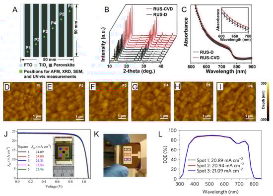 (A) Schematic drawing showing the six positions for the XRD, UV–vis measurements, and AFM carried out on perovskite films prepared through RUS-D and RUS-CVD methods. (B) XRD pattern of the six intentionally selected points. (C) UV–vis absorbance spectra of the six intentionally selected points. (D–I) AFM images of the six intentionally selected points. Reprinted from Ref. [12] with permission from Wiley-VCH. (J) Photovoltaic parameters from five different spots with an aperture area of 0.16 cm2 were selected from the total active area of 1.2 × 1.2 cm2 under standard AM 1.5 G illumination. Reprinted from Ref. [38] Copyright 2016, Science. (K,L) EQE spectra from three different spots on a large-area (>1-cm2) cell. Reprinted from Ref. [39]. Copyright 2017, Springer Nature.