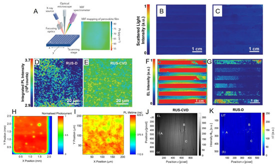(A) X-ray fluorescence mapping of lead (Pb) on a typical perovskite film. (B,C) False-color monochrome scattered light optical images of perovskite films. (D,E) False-color monochrome PL mapping images of the FAPb(I0.85Br0.15)3 films. (F,G) False-color monochrome EL mapping images of perovskite modules prepared by (F) RUS–CVD and (G) RUS–D methods. Reprinted from Ref. [12] with permission from Wiley-VCH. (H) LBIC image of the device that includes a perovskite layer. (I) TRPL maps of the spray-casted film. Reprinted with permission from Ref. [15] under CC-BY license. Copyright 2018 American Chemical Society. (J,K) Comparison of an EL image J and a LIT image (K) of a 30 × 30 cm2 CIGS module at an injection current of 0.83 mA cm2. The EL image was captured within 3 s, whereas the measurement duration for the LIT image was 30 min. The letters A, B, and C indicate defects of different strengths. Reprinted from Ref. [41], Copyright 2014, with permission from Elsevier.