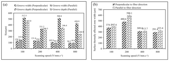 By analyzing the experimental results, it is found that the two laser-processing directions of the perpendicular-to-fiber direction and parallel-to-fiber direction show similar laws. The width of the thermally affected zone, in the parallel-to-the-fiber-arrangement direction, is slightly larger than that in the perpendicular-to-the-fiber arrangement direction. However, the groove depth in the parallel direction is smaller than that in the perpendicular direction. This is because the Cf/SiC composites have anisotropy, and the heat generated by laser processing is easy to propagate along the carbon fiber direction. The composite materials at the groove openings are subject to significant machining stress due to the heat and the high-velocity jet of the molten material. When the processing path is parallel to the carbon fiber texture, all parts of the entire fiber will be subjected to processing stress. Due to the good adhesion between the fibers and the matrix, the carbon fibers are not easily broken. When the processing path is perpendicular to the carbon fiber texture, the stress effect on the composite material can only be borne by the local material. Therefore, the carbon fiber will be broken, and the groove width will become larger. According to the theorem of energy conservation, when the heat propagates along the fiber direction, the depth of the crack become smaller. When the heat propagates along the direction of the crack depth, the surface thermally affected zone width become smaller.