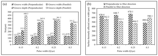 Effect of the pulse width on the composite surface groove ((a). variation in groove width and depth; (b). variation in thermally affected zone width).