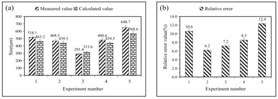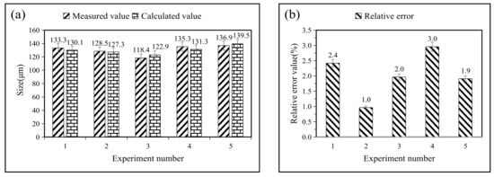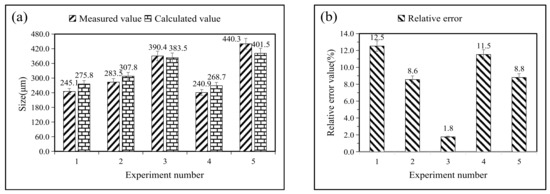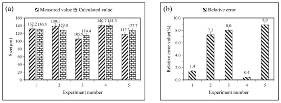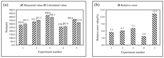 Five sets of experimental data are brought in, and the accuracy is verified by calculating the relative error of these regression models. The values of the four parameters of the laser treatment variables are substituted into Equations (6) to (11), and the relative errors are obtained from the following two equations: