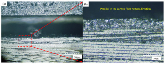 In the processing, the laser heat absorbed by the composites will be propagated, along with the carbon fiber. When the temperature rises to a certain level, the high bending resistance of the composite materials will be greatly reduced. As a result, the composite fibers at the openings of the trenches are largely fractured, as shown in Figure 8. As the temperature increases, the thermal diffusivity of Cf/SiC decreases, and the thermal conductivity of the composites also decreases. When the laser scanning times increase, the temperature of the composite processing zone increases, and the thermal conductivity of the Cf/SiC decreases. Therefore, whether it is perpendicular to the fiber direction or parallel to the fiber direction, with the increment of the scanning times, the width of the thermally affected zone decreases. During processing, heat transfer is mainly carried out by diffusion, and the heat transfer speed in the direction of the fiber is significantly faster than that in other directions. Therefore, when the variable parameter is the pulse width, the width of the thermally affected zone perpendicular direction is larger than that of the parallel direction. However, the thermal diffusivity of the 2.5-dimensional braided Cf/SiC composites is mainly affected by the radial direction of the carbon fiber and the SiC matrix [41]. The thermal conductivity of the material is mainly affected by thermal diffusivity. So, in other variable parameter experiments, the width of the thermally affected zone in the parallel direction is slightly larger than that in the perpendicular direction.
