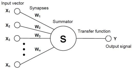 The application of ANN, one of the best tools for creating MCM of experimental data, is based on the Kolmogorov–Arnold theorem [25,26,27] and its special cases considered by Hecht-Nielsen [28]. From a computational point of view, ANN is a structure that includes a certain number of processing elements and which executes a fixed set of mathematical functions. This processing element is called an artificial neuron (AN). It consists of an input vector (Xi), synapses, a summator, a nonlinear transfer function, and an output signal value, as shown in Figure 1 [8].