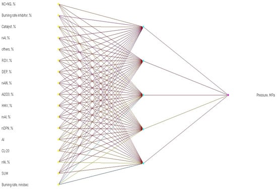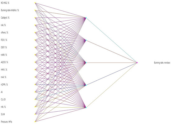 The one of possible ANN structure for solving the inverse task (Figure 6) consists of one input layer (17 neurons which correspond 16 factors and 1 goal function—burning rate which we have to obtain), one hidden (inner) layer (5 neurons) and one output layer (1 neuron which corresponds 1 factor—pressure which have to help us to rich the required value of burning rate).