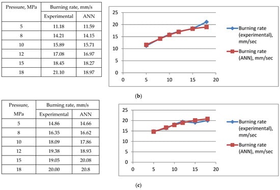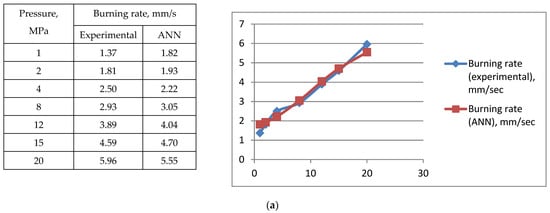 The examples of the results of that calculation of the ANN MCM that solves the inverse task and the graph of connection of the burning rate and pressure are depicted in Table 2 and Figure 7.
