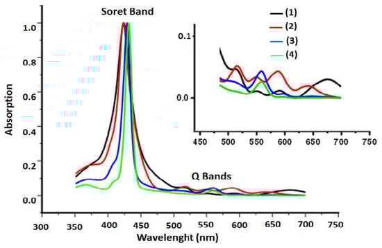 UV–visible spectra of compounds (1)–(4) recorded in dichloromethane at concentrations ~10−6 M. The inset shows the enlarged view of the Q bands region.