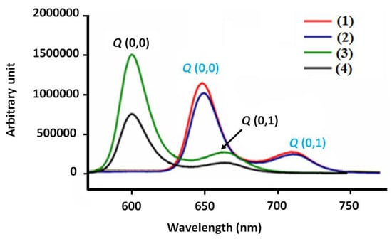 As shown in Figure 2, we noticed a major hypochromic shift of approximately 50 nm of the Q(0,0) and Q(0.1) bands between free-base porphyrins (1) and (2) and their corresponding zinc porphyrins. The Q(0,0) and Q(0,1) emission bands of compounds (3) and (4) had wavelengths of about 600 and 665 nm, respectively. The quantum yield values of compounds (1)–(4) were 0.085, 0.078, 0.054, and 0.033, respectively. The decrease in the fluorescence quantum yield values (Φf) was due to the insertion of zinc(II) on the free-base porphyrins. The fluorescent lifetime values of compounds (1)–(4) were 8.61, 8.78, 3.1, and 1.91, respectively. The photophysical property values of the synthesized compounds showed that they could be used for various optoelectronic applications, a priori DSSC systems.