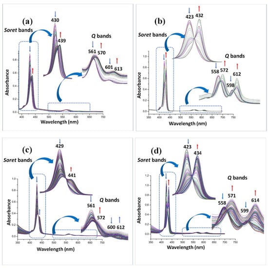 Evolution of the Q and Soret bands: (a) complex (4) as a function of the addition of the Cl− anion, (b) [Zn(TTP)] as a function of the addition of the Cl− anion, (c) complex (4) as a function of the addition of the Br− anion, and (d) [Zn(TTP)] as a function of the addition of the Br− anion.