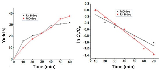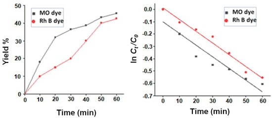 The kinetics of the degradation reaction can be described using a first-order model for low concentrations of the MO and RhB dye solutions. The pseudo first-order kinetics equation is expressed as follows (Equation (5)):