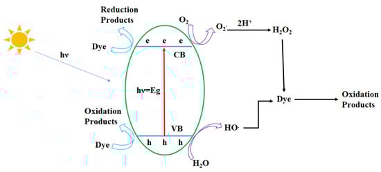 The principle of heterogeneous photocatalysis (Figure 6) is based on the activation of complex (4) by a supply of light energy hν ≥ Eg (Eg = band gap energy). During this activation step, an electron (e−)/hole (h+) pair is created, which results from the passage of an electron from the valence band to the conduction band. The electron will react with the oxygen adsorbed on the surface of our porphyrinic compounds, while the hole h+, reacts with the surface of the OH ions to form highly oxidizing hydroxyl radicals (OH.), which is responsible for the degradation of pollutants.