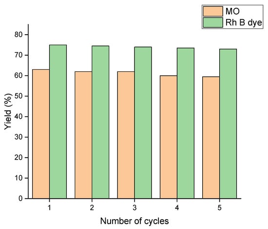Complex (4), repeatedly used, exhibited properties identical to those of the initial complex, with no obvious drop in photocatalytic efficacy even after five cycles, achieving photodegradation efficiency of 60% and 73% for the MO and RhB dyes, respectively (Figure 7).