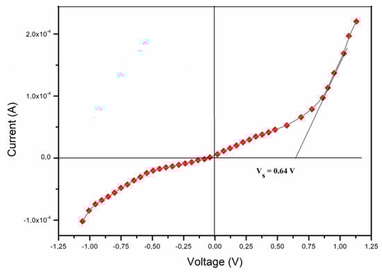 The I-V measurements were obtained using a Keithley 236 instrument and the spectroscopic impedance measurement was performed using an impedance analyzer (Solartron 1260). The electronic properties of the ITO/complex (4)/Al system can provide information about the transmission properties in organic materials. The current-voltage curve measured at room temperature of the ITO/Complex (4)/Al system is shown in Figure 8. The curve shown in this figure presents a similar behavior to that of electronic devices, such as diodes, indicating complex (4) could be used as a photosensitizer in DSSCs (dye-sensitized solar cells) [57,58,59,60]. The threshold voltage was approximately 0.64 V.