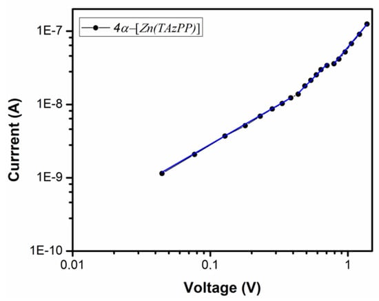In addition, we studied the mechanism of electrical conduction through the junction by presenting the I-V characteristics in double logarithmic plot (Figure 9). The I-V plot of the ITO/complex (4)/Al system showed the presence of different parts in which the current depended mainly on the applied voltage. At low voltage, the first part of the curve corresponded to a value of the slope in the order of 1.2, indicating prevention of the charge injection due to the presence of a small amount of interface barrier. For this part of the curve, which defines the ohmic region, the amount of the heat-activated charge carriers was too small and the trap levels were vacant. The current density equation is as follows (Equation (6)):