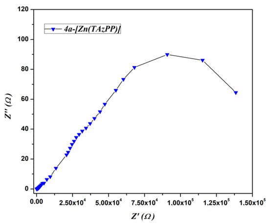 This equation shows that the complex impedance Z(ω) is composed of two parts: the first part is the real part (Re (Z) = Z’) and the second part is the imaginary part (Im (Z) = Z”). The semicircular spectrum present in the impedance spectrum (Nyquist plot) of the complex (4) structure suggested the homogeneity of the electrode-organic interface (Figure 10).