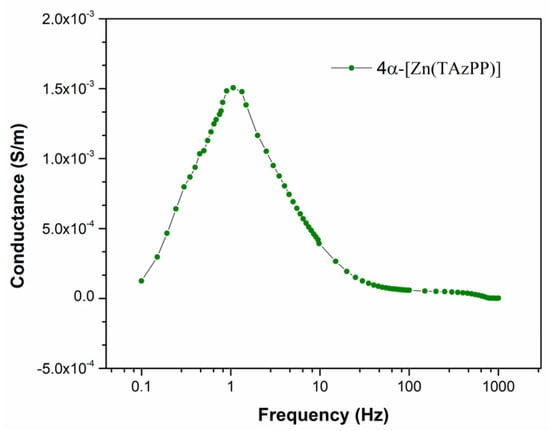 Figure 11 shows two regimes of conductance of complex (4), which depended essentially on the frequency applied. The first regime was observed at low frequency, where the conductance increased with increasing frequency until reaching a maximum at a frequency of approximately 1.4 Hz, which indicated a disordered system. However, the second regime observed at high frequency indicated that the conductance tended toward zero, where the dipoles neglected the frequency. This phenomenon was associated with the jump transport mechanism, where the dipoles will be guided by the applied field, which will lead to an increase in the charge hopping process (Figure 11) [67].
