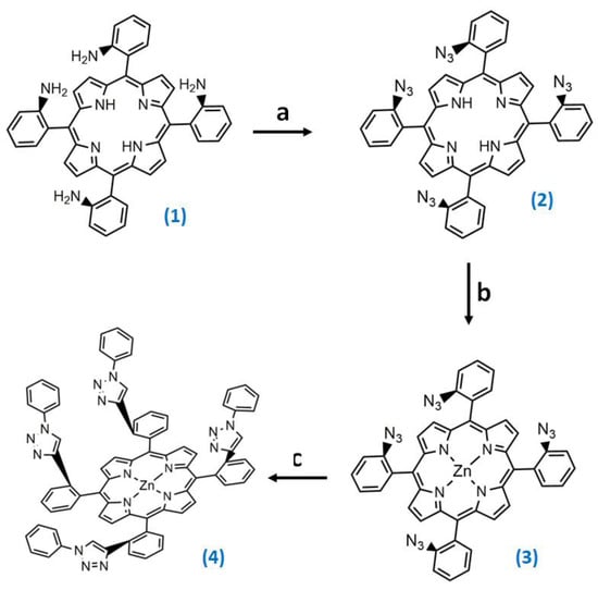 General scheme for the synthesis of compounds (1–4): (a): (1) HCl, H2O; (2) NaNO2, HCl, H2O; (3) NaN3, HCl, H2O, (b): Zn(OAc)∙2H2O, CHCl3/C2H5O, (c): CuI, Et3N, Phenylacetylene, in THF/Acetonitrile.