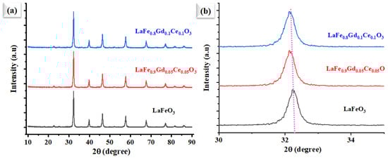 Figure 1a shows the XRD pattern LaFeO3, LaFe0.9Gd0.05Ce0.05O3-δ, and LaFe0.8Gd0.1Ce0.2O3-δ in the 2θ range from 10–90°. The central peaks of the LaFeO3 diffraction pattern are located at 23, 32, 39, 46, 57, 68, and 76, which can be indexed to the (100), (110), (111), (200), (211), (220), and (310) planes, respectively, of the cubic structure, with space group pm-3m (221) and a lattice of a = b = C = 3.94 and α = β = γ 90° [16]. Moreover, Figure 1b shows the comparative diffraction pattern of LaFeO3, LaFe0.9Gd0.05Ce0.05O3-δ, and LaFe0.8Gd0.1Ce0.2O3-δ in the 2θ range from 30–37° where the dominant diffraction peaks of La0.1Sr0.9Co0.9Ce0.1O3-δ and La0.2Sr0.8Co0.8Ce0.2O3-δ at 2θ of 32° shift towards a lower angle, possibly because of the high ionic radius of Gd3+ and Ce4+/3+ ion [17,18].