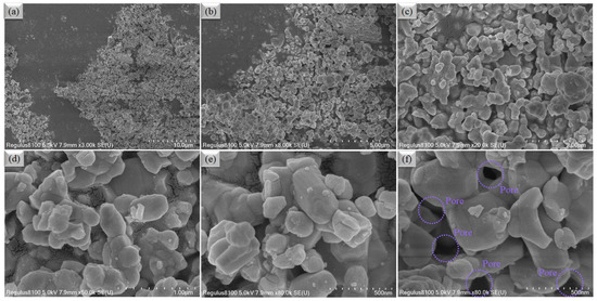 (a–f) The surface morphology studied by SEM for LaFe0.8Gd0.1Ce0.1O3-δ powder at different scale of 10–500 nm.