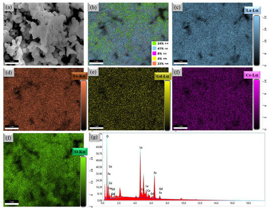 Figure 2a–f shows the microscopic SEM image of LaFe0.8Gd0.1Ce0.1O3-δ at a different scale. The morphology of LaFe0.9Gd0.05Ce0.05O3-δ is shown to be very fine and nano-structured. The LaFe0.9Gd0.05Ce0.05O3-δ shows the particle size of about 50 nm. Figure 2a–f shows the SEM image of LaFe0.9Gd0.05Ce0.05O3-δ, where a highly porous structure can be seen, while Figure 3b–f shows the EDS mapping image of LaFe0.8Gd0.1Ce0.1O3-δ of SEM image in Figure 3a. The EDS mapping image of the chemical distribution of each element in LaFe0.8Gd0.1Ce0.1O3-δ can clearly be seen. The elemental mapping image with mixed colors was used to reveal the chemical distribution by energy dispersive spectroscopy (EDS), where the homogenous chemical concentration of each element such as La, Fe, Gd, Ce, and O can be identified [19]. Moreover, the mapping of the chemical distribution of each element individually is shown in Figure 3c–f measured using SEM image in Figure 3a, which could help estimate the chemical distribution [20,21]. Moreover, Figure 3g shows the EDS spectrum of the LaFe0.8Gd0.1Ce0.1O3-δ sample, which could help one to understand the actual chemical composition of the powder.