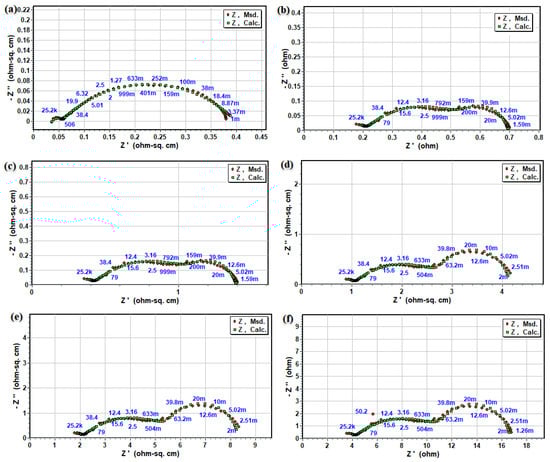 (a–f) Nyquist plot of impedance spectra for symmetrical LaFe0.8Gd0.1Ce0.1O3-δ electrode cell cathode over SDC electrolyte different operating temperatures of 550 °C, 525 °C, 500 °C, 475 °C, 450 °C, and 425 °C, respectively.